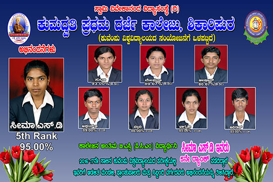 ಕುಮದ್ವತಿ ಪದವಿ ಕಾಲೇಜಿನ ಬಿ.ಎಸ್ಸಿ ವಿದ್ಯಾರ್ಥಿನಿ ಸೀಮಾ ಎಸ್.ಡಿ 5ನೇ ಶ್ರೇಣಿ ಪಡೆದಿದ್ದಾರೆ
