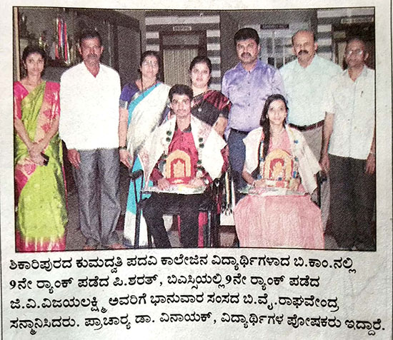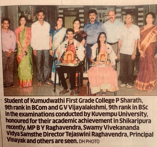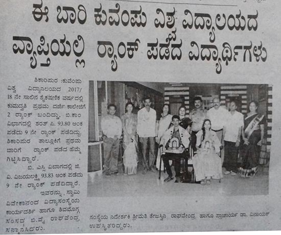 Kumadvathi First Grade College > Media Watch > ಕುವೆಂಪು ವಿಶ್ವ ವಿದ್ಯಾಲಯದ ವ್ಯಾಪ್ತಿಯಲ್ಲಿ ರ್‍ಯಾಂಕ್ ಪಡೆದ ವಿದ್ಯಾರ್ಥಿಗಳು