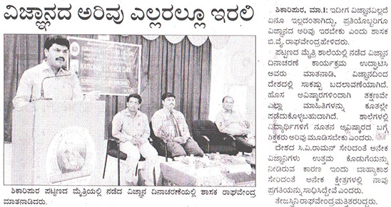 ಶಿಕಾರಿಪುರ ಕುಮದ್ವತಿ ಪ್ರಥಮ ದರ್ಜೆ ಕಾಲೇಜಿನಲ್ಲಿ ನಡೆದ ವಿಜ್ಞಾನ ದಿನಾಚರಣೆ ಕಾರ್ಯಕ್ರಮದಲ್ಲಿ ಶಾಸಕ ಬಿ.ವೈ.ರಾಘವೇಂದ್ರ ಮಾತನಾಡಿದರು.