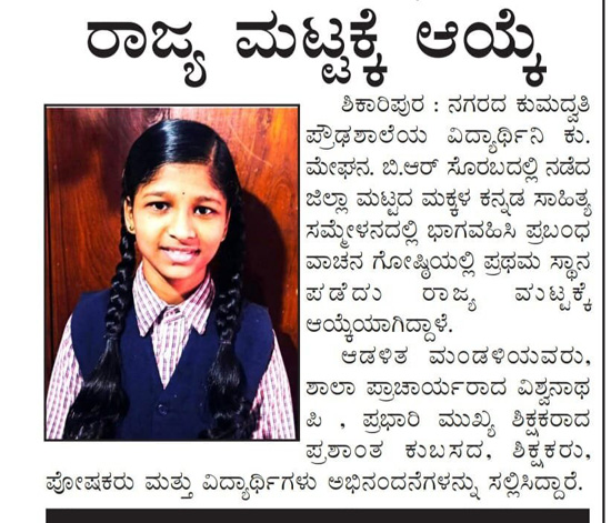 > ಜಿಲ್ಲಾ ಮಟ್ಟದ 9ನೇ ಮಕ್ಕಳ ಸಾಹಿತ್ಯ ಸಮ್ಮೇಳನಕ್ಕೆ ಆಯ್ಕೆ ಆದ ಕುಮದ್ವತಿ ಪ್ರೌಢ ಶಾಲೆಯ ವಿದ್ಯಾರ್ಥಿ