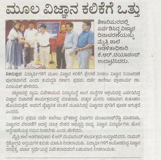 ಶಿಕಾರಿಪುರದಲ್ಲಿ ಏರ್ಪಡಿಸಿದ್ದ ವಿಜ್ಞಾನ ದಿನಾಚರಣೆಯನ್ನು ಮೈತ್ರಿ ಶಾಲೆ ಆಡಳಿತಾಧಿಕಾರಿ ಕೆ.ಆರ್.ದಯಾನಂದ್ ಉದ್ಘಾಟಿಸಿದರು.
