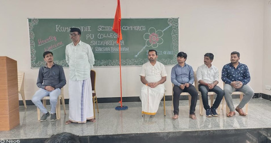 ದಿನಾಂಕ 11/08/22 ರ ಸಂಜೆ ಕುಮದ್ವತಿ ವಸತಿ ನಿಲಯದ ಪ್ರಥಮ ಮತ್ತು ದ್ವಿತೀಯ ಪಿಯುಸಿ ವಿದ್ಯಾರ್ಥಿಗಳಿಗೆ ವಿಶ್ವನಾಥ್ ಮತ್ತು ಶರತ್ ಇವರು ರಕ್ಷಾ ಬಂಧನದ ಐತಿಹಾಸಿಕ ಮತ್ತು ಪೌರಾಣಿಕ ಹಿನ್ನಲೆ ಮತ್ತು ರಕ್ಷಾ ಬಂಧನದ ಮಹತ್ವವನ್ನು ತಿಳಿಸಿದರು ಈ ಕಾರ್ಯಕ್ರಮದಲ್ಲಿ ಪದವಿ ಮಹಾವಿದ್ಯಾಲಯದ ಉಪನ್ಯಾಸಕರು ವಸತಿ ನಿಲಯದ ಪಾಲಕರು ಹಾಗೂ ದೈಹಿಕ ಶಿಕ್ಷಕರು ಉಪಸ್ಥಿತರಿದ್ದರು,