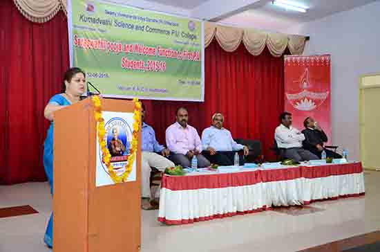 Smt. Tejaswini Raghavendra, director,SVVS, Shikaripura, addressing the students on the occasion of wellcome function