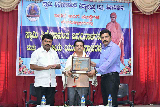 Du .GU. Lakshman, Chief editor of Hosadigantha, being felicitated by Sri, B Y Ragavendra Secretary, SVVS and Sri, B Y Vijayendra, Treasurer, SVVS on the occasion of Swamy Vivekananda jayanthi.