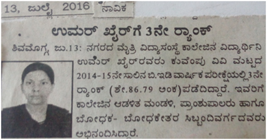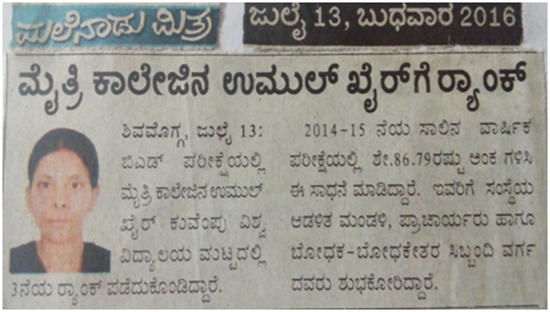 2014-2015 ನೇ ಸಾಲಿನ ಕುವೆಂಪು ವಿವಿ ಮಟ್ಟದ ಬಿ.ಇಡಿ ವಾರ್ಷಿಕ ಪರೀಕ್ಷೆಯಲ್ಲಿ ಮೈತ್ರಿ ಶಿಕ್ಷಣ ಮಹಾವಿದ್ಯಾಲಯದ ಉಮುಲ್ ಖೈರ್ ರವರು(ಶೇ.86.79ಅಂಕ) ಗಲಿಸಿ 3ನೇ ರ್ಯಾಂಕ್ ಪಡೆದಿರುತ್ತಾರೆ.
