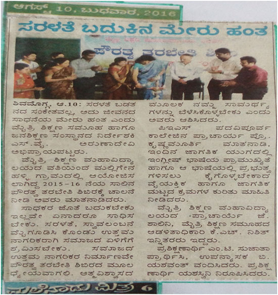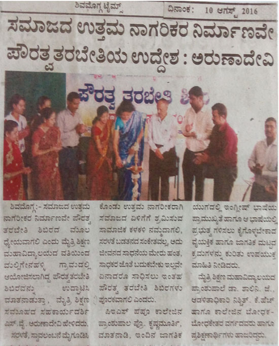 ದಿನಾಂಕ: 08/08/2016 ರ ಮಂಗಳವಾರ ಮೈತ್ರಿ ಶಿಕ್ಷಣ ಮಹಾವಿದ್ಯಾಲಯದ ವತಿಯಿಂದ ಮಲ್ಲಿಗೇನಹಳ್ಳಿ ಗ್ರಾಮದಲ್ಲಿ 2015-2016ನೇ ಸಾಲಿನ ಪೌರತ್ವ ತರಬೇತಿ ಶಿಬಿರವನ್ನು ಆಯೋಜಿಸಲಾಜಿಸಲಾಗಿತ್ತು ಈ ಶಿಬಿರದ ಉದ್ಘಾಟನೆಯನ್ನು ಶ್ರೀಮತಿ ಅರುಣಾದೇವಿ ಎಸ್,ವೈ ಸಹಕಾರ್ಯದರ್ಶಿಗಳು ಮೈತ್ರಿ ಶಿಕ್ಷಣ ಸಮೂಹ ರವರು ನೆರವೇರಿಸಿದರು.