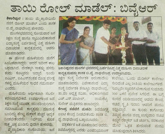 ಶಿಕಾರಿಪುರದ ಮಂಗಳ ಭವನದಲ್ಲಿ ಏರ್ಪಡಿಸಿದ್ದ ವಿಶ್ವ ಮಹಿಳಾ ದಿನಾಚರಣೆ ಕಾರ್ಯಕ್ರಮವನ್ನು ಶಾಸಕ ಬಿ.ವೈ.ರಾಘವೇಂದ್ರ ಉದ್ಘಾಟಿಸಿದರು.